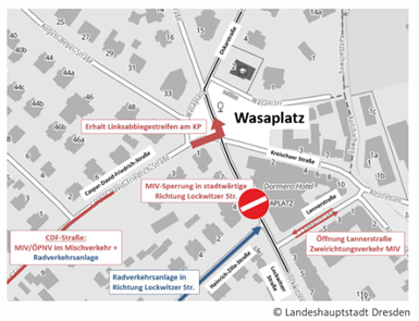 3. Weil entgegen ursprünglicher Planungen für die Stadtbahn 2020 nun nicht mehr davon die Rede ist, dass die Campuslinie die Buslinie 61 ersetzen soll (diese soll weiterhin fahren, Ersatz soll die Bahn neuerdings nur noch für die Verstärkerbusse liefern), ist der Verkehrsknoten Wasaplatz überlastet. Um hier eine Entlastung zu erreichen, soll die Lockwitzer Straße in stadtwärtiger Richtung für den MIV gesperrt werden. Im Gegenzug soll die Lannerstraße, bisher Einbahnstraße, künftig in beide Richtungen befahrbar sein. Das führt zu neuen Problemen, weil an der Ecke Lannerstraße/Kreischaer Straße ein Linksabbiegen - auch aufgrund querender Fußgänger - nur mit zusätzlicher Ampel möglich ist (die ist in den Planungen jedoch nicht enthalten ...). Zudem müssten an beiden Enden der Lannerstraße vorgestreckte Bordsteine zurückgebaut werden - welche Idiotie, wenn man bedenkt, dass der Bau von vorgestreckten Bordsteiner zur Vermeidung von Kreuzungsparken andernorts regelmäßig neu erfolgt. Hier haben wir das im Bestand und man will es zurückbauen.